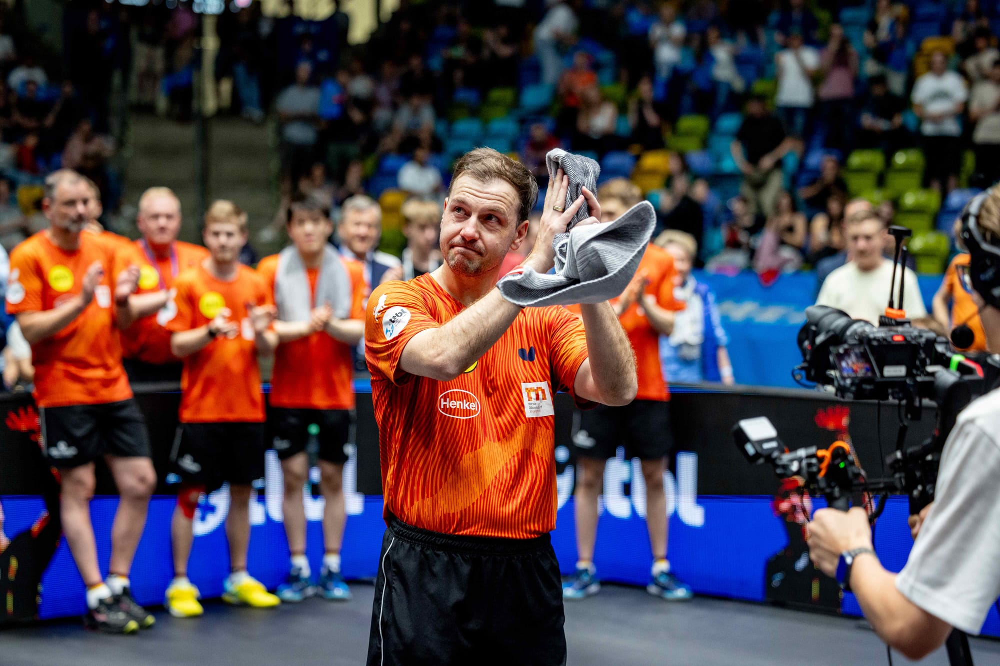 Nachdem der erste Jubelsturm Ochsenhausens abgeklungen war, stand wieder Boll im Fokus. Während die Fans auf ihren Plätzen standen und den 44-Jährigen mit „Timo Boll“-Sprechchören feierten, gab es in der Box eine emotionale Abschiedsrunde, bei der zahlreiche Weggefährten einige Abschiedsworte sprachen und kurze Videogrüße weiterer Sportstars wie Felix Neureuther, Thomas Müller und Toni Kroos eingespielt wurden. „Du bist ein super Spieler und immer ein super Freund. Danke für alles“, sagte etwa Patrick Franziska (1. FC Saarbrücken TT) mit Tränen in den Augen.